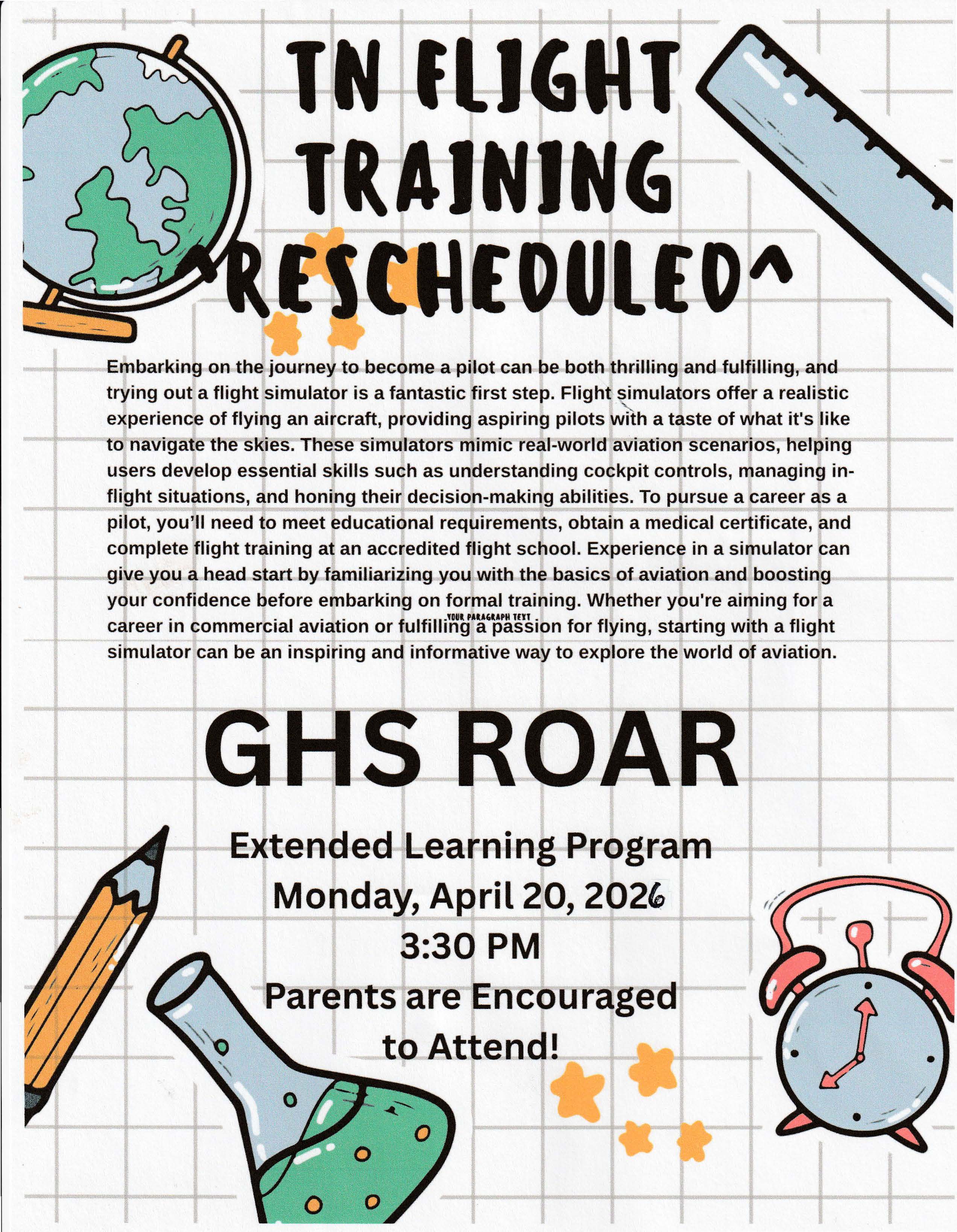 GHS Roar has rescheduled the TN Flight Training. Join us on Monday, April 20, 2026 at 3:30 pm!